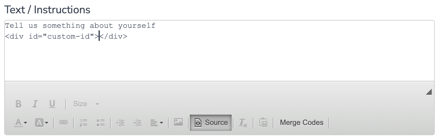 Switch the editor to Full Mode by clicking the 3 horizontal dots, then switch to Source and , under the text add the following HTML snippet: <div id="custom-id"></div>. Later on, this div will contain the video recorder. Here's how it should look: